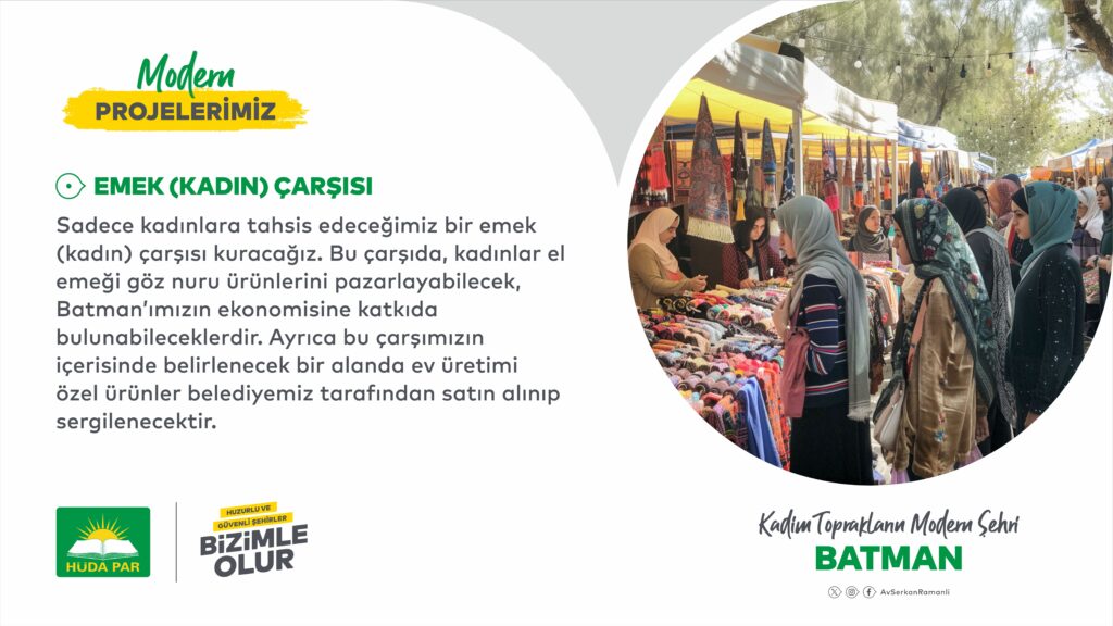 HÜDA PAR Milletvekili ve Batman Belediye Başkan adayı Serkan Ramanlı, proje lansman programında açıkladığı projelerden ‘Emek (Kadın) Çarşısı’ projesinin ayrıntılarını paylaştı.