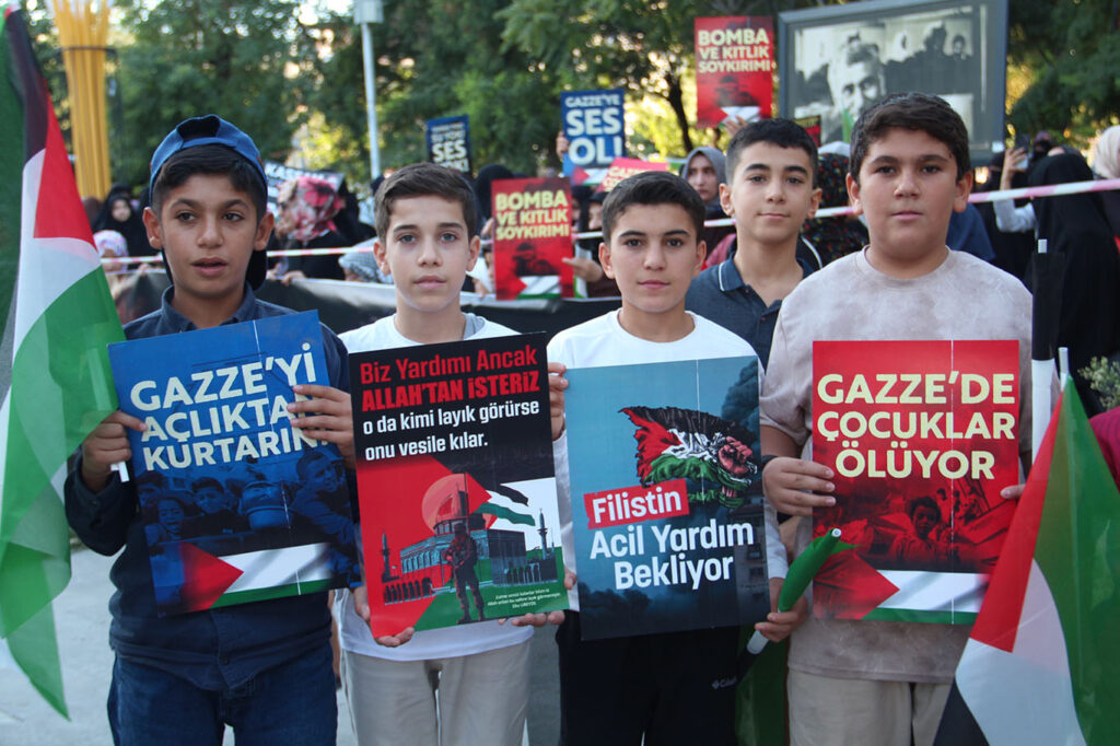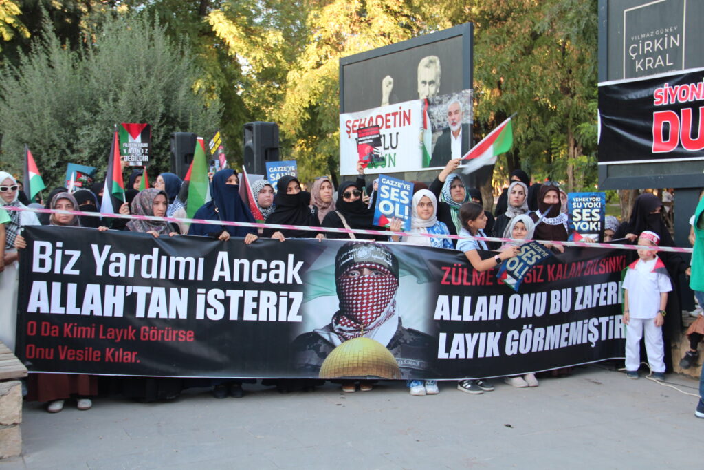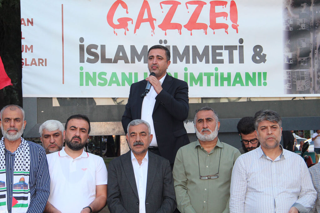 “Gazze’deki kardeşlerimiz, bizzat şehit İsmail Heniyye, canımızla ve malımızla onlara destek olamazsak da kendilerini unutmamamızı istedi. Şehirlerde, meydanlarda sesimizi kendileri için yükseltmemizi istedi. Bugün bizler bu vasiyete ve Gazze halkına sahip çıkıyoruz.”