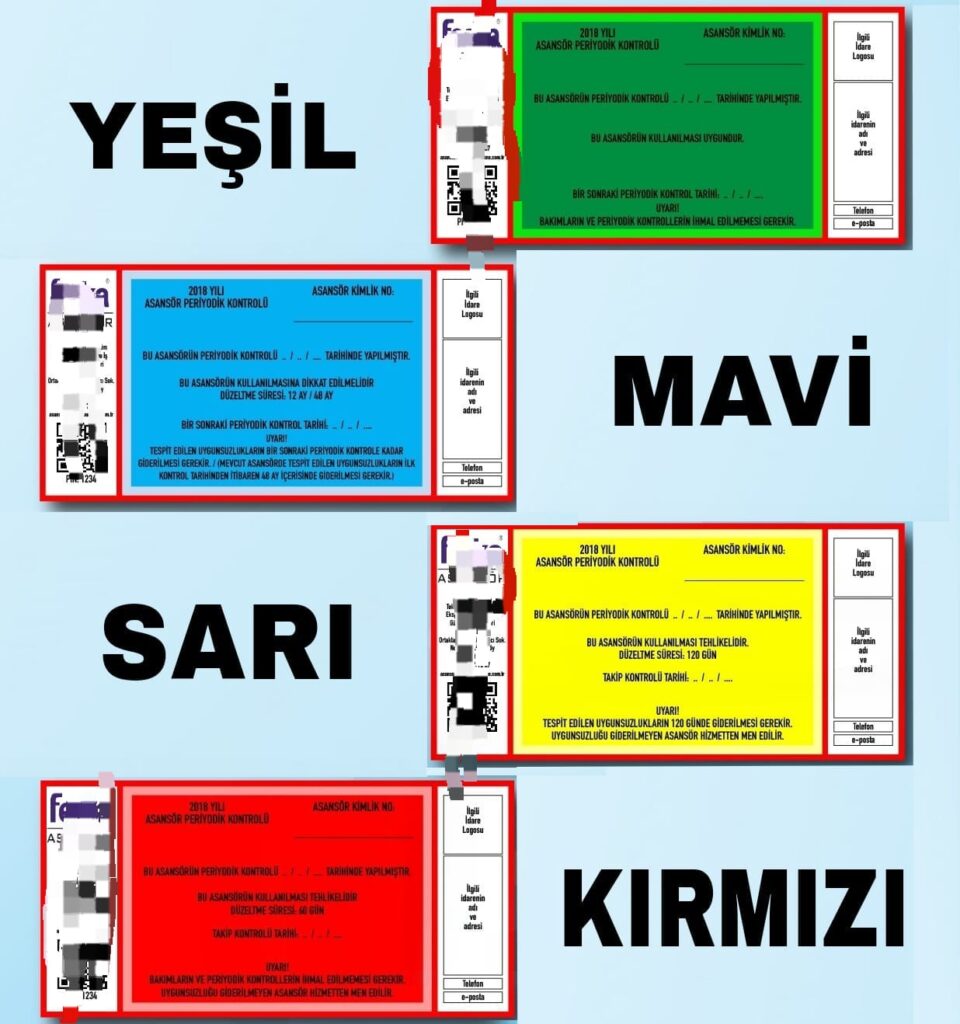Denetimlerde asansörler, güvenlik durumlarına göre kırmızı (kullanılamaz), sarı (güvensiz), mavi (hafif kusurlu) ve yeşil (güvenli) etiketlerle sınıflandırılıyor.