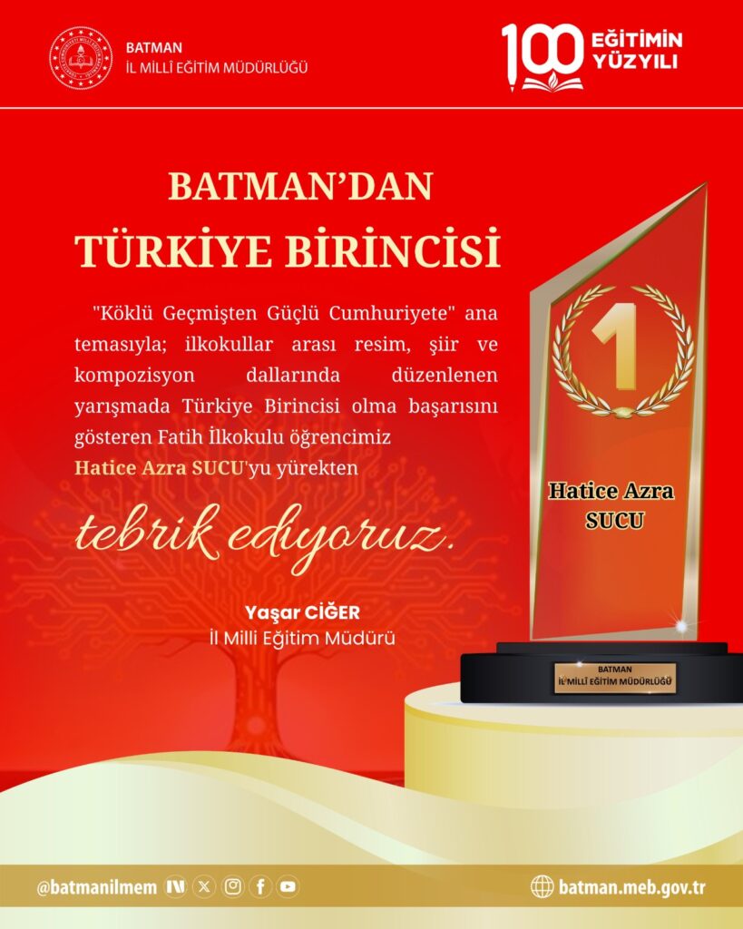 Batman İl Millî Eğitim Müdürlüğü, öğrencinin elde ettiği bu başarıdan büyük gurur duyduklarını belirterek Hatice Azra Sucu’ya eğitim hayatında başarılar diledi.