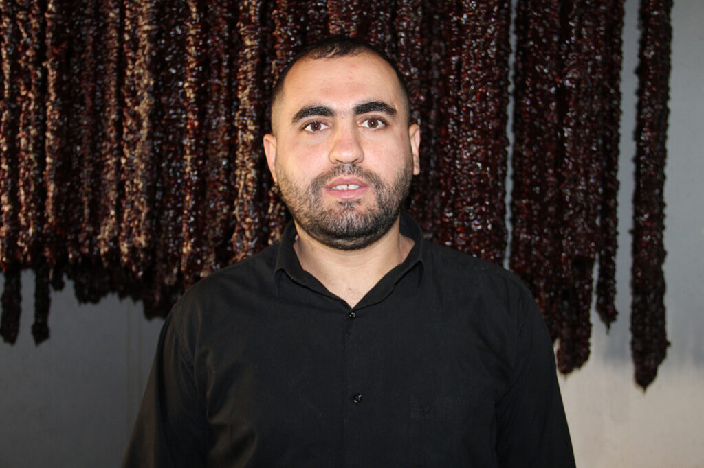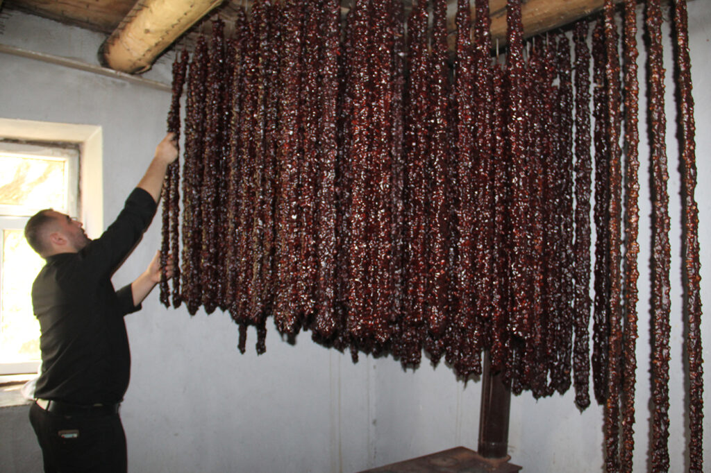 “Biz senelerdir cevizli sucuk üretimini yapıyoruz, elhamdülillah. Bu sene de iki-üç aydır başladık, bir iki-üç ay daha sürecek. Yerel malzememiz var; yerel ceviz, yerel pekmez, yerel üzüm kullanıyoruz. Orijinal balımız da var. Her zaman yerel ürünlerle, doğal şekilde yapıyoruz.”