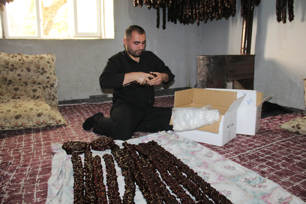 “Önce cevizleri iplerden geçiriyoruz, ardından pekmezli bulamacı hazırlıyoruz. Cevizleri bulamaçtan geçirip daldırıyoruz, sonra kurutmaya bırakıyoruz. Bu süreç en az dört-beş gün, bazen bir haftayı buluyor. Yani oldukça meşakkatli bir iştir.”