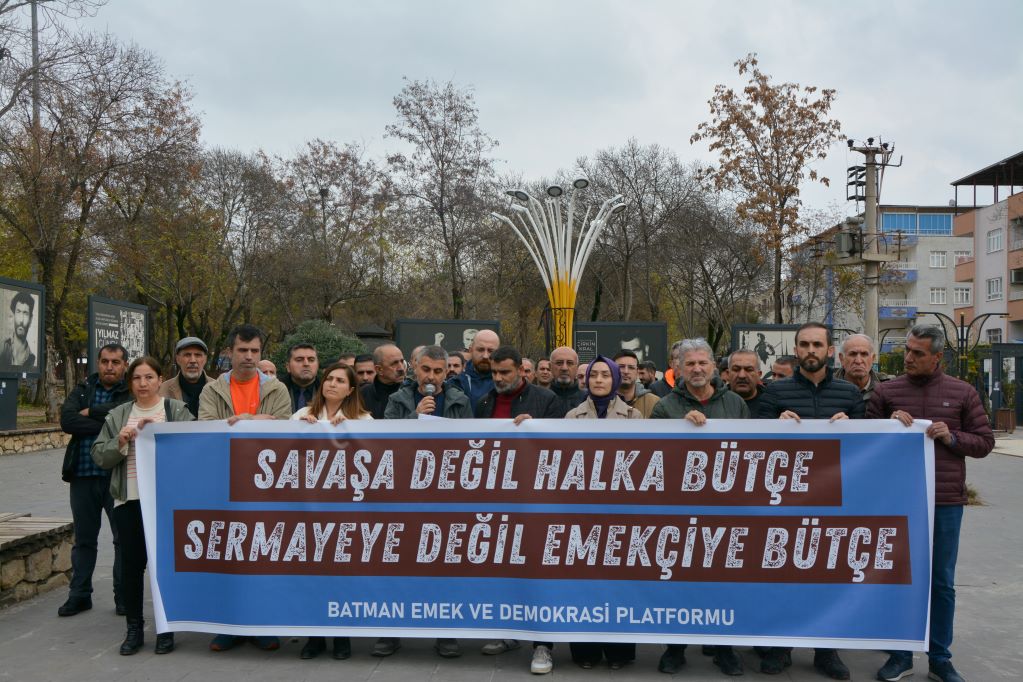 Batman Emek ve Demokrasi Platformu, Yılmaz Güney Sergi Alanı’nda “Savaşa Değil Halka Bütçe – Sermayeye Değil Emekçiye Bütçe” sloganıyla basın açıklaması yaptı. Açıklama öncesinde Haber-Sen Batman İl Temsilcisi Seyran Karabulut kısa bir değerlendirme konuşması yaptı.