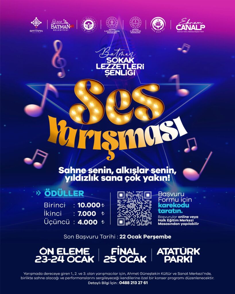Batman Belediyesi öncülüğünde düzenlenecek Batman Sokak Lezzetleri Şenliği kapsamında bir Ses Yarışması gerçekleştirilecek. Yarışma, müziğe ilgi duyan katılımcıları bir araya getirmeyi amaçlıyor.