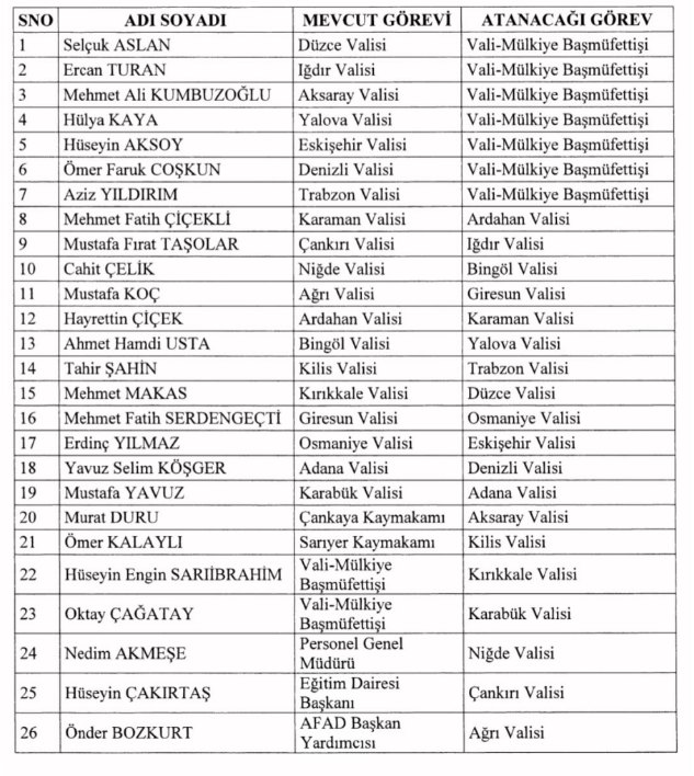 Valisi değişen iller arasında Düzce, Iğdır, Aksaray, Yalova, Eskişehir, Denizli, Trabzon, Karaman, Çankırı, Niğde, Ağrı, Ardahan, Bingöl, Kilis, Kırıkkale, Giresun, Osmaniye, Adana ve Karabük yer aldı. Valilerden 7’si merkeze çekilirken, 12’sinin görev yeri değiştirildi.